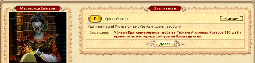 Сойгура, мастерица на все руки, предлагает нам новый квест! "Убивая Крэтсов-вожаков, добыть Тяжелый кинжал Крэтсов (10 шт) и принести их мастерице Сойгуре на Площадь огня." Известно, что вожаки бывают двух типов: есть те что в Логове и те что в Чернагском Ущелье и в Огненной Долине. Кстати, первые немного покрепче. При каждой победе получаем Тяжелый кинжал Крэтсов 1 шт. Собираем и относим Сойгуре. новость неокончена! |