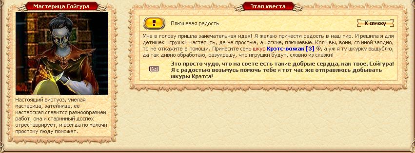 Привет всем любителям квестов! Администрация игры решила обрадовать магмаров в честь годовщины Легенды и внесла новый квест, начиная с 3 лвл. Забираем его на Площади Огня у мастерицы Сойгуры *Мастерица решила забыть на время о делах военных и заняться производством столь необходимых вещей для самых маленьких, как мягкие игрушки. Сойгура просит вас помочь ей в этом нелегком деле.* Идём в Логово Крэтсов, а именно на Развилку или на Центральную развилку и убиваем по-тихоньку крэтсов-вожаков, а потом приносим мастерице их шкуры В качестве премии за прохождение квеста получаем: 400 опыта, Плюшевый крэтс 3 шт.